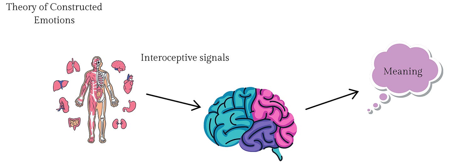 According to the theory of constructed emotion, emotions are the conscious interpretation of interoceptive signals from the body. Emotions are the meanings we attribute to the interoceptive signals of the body that end up reaching our awareness. This process of choosing the interoceptive signals and assigning an interpretation would all be conducted according to the principle of brain as active inference.